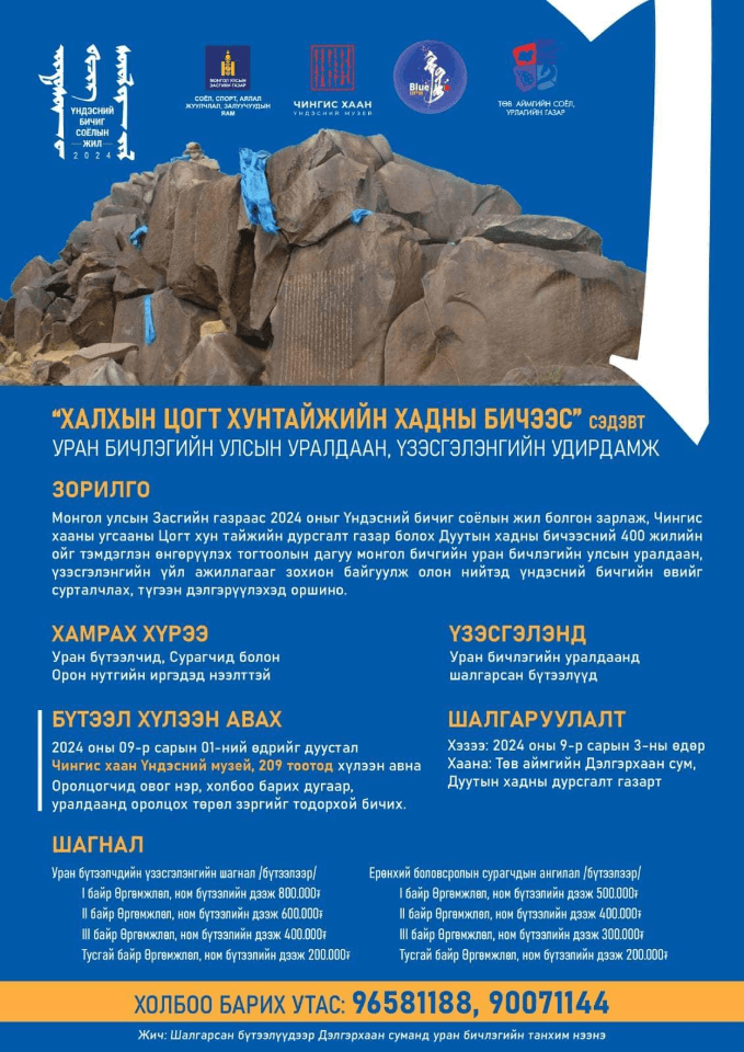 Энэ хүрээнд Соёл, спорт, аялал жуулчлал, залуучуудын яам, Чингис хаан Үндэсний музей, “Хөх бичиг” бичиг соёлын академи, Төв аймгийн Соёл, урлагийн газар хамтран “Халхын цогт хунтайжийн хадны бичээс” уран бичлэгийн үзэсгэлэн, улсын уралдааныг өнгөрсөн зургаадугаар сард бүх насныханд зориулан зарласан билээ.