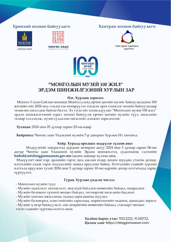 - Музейн үзмэр баяжуулалт, сан хөмрөгийн өнөөгийн байдал, стандарт нөхцөл гэсэн сэдвийн хүрээнд илтгэлийг хүлээн авна.